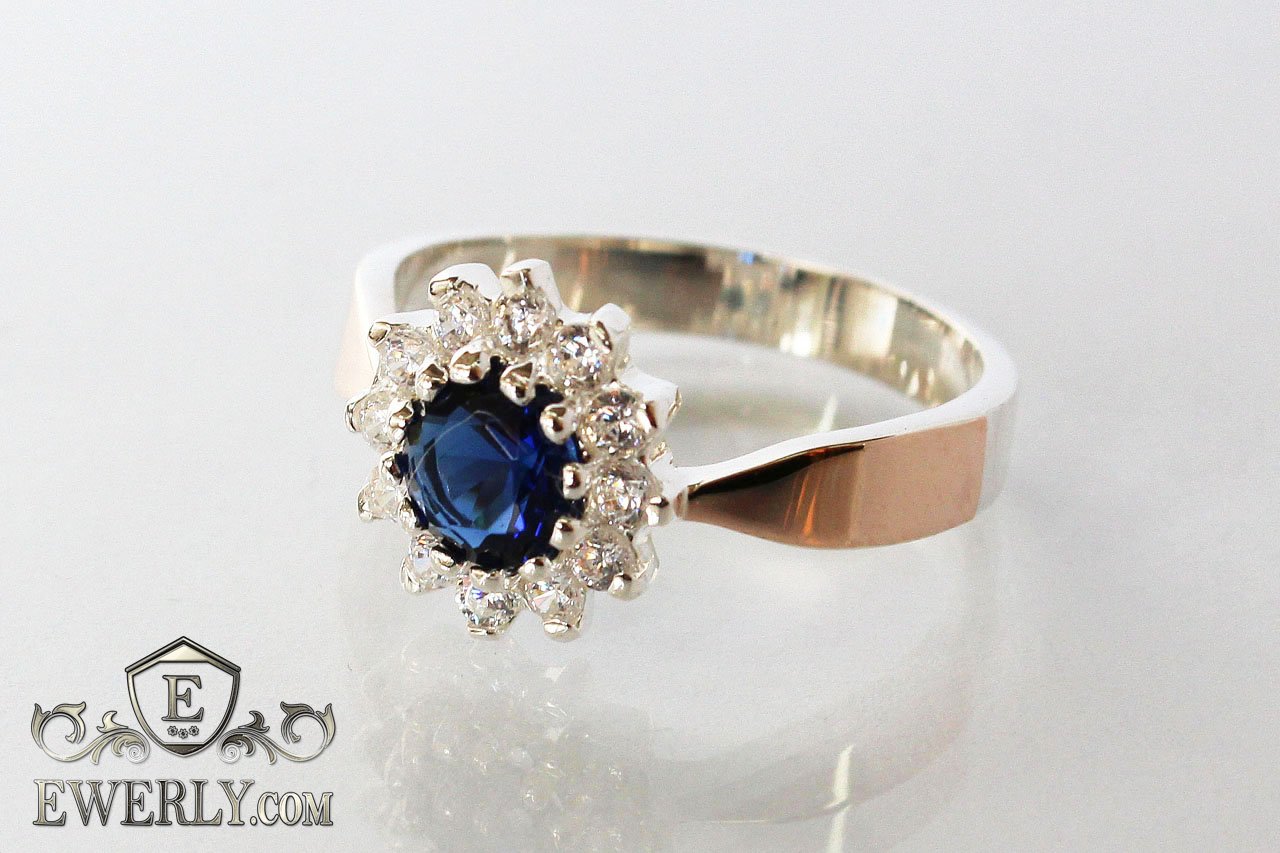 A ring that captivates at first sight: in the center of the composition is a large cubic zirconia of a deep blue hue in a multifaceted cut. It shines in the frame of a star pattern, the rays of which are laid out from sparkling white stones, creating the effect of a soft glow and depth.