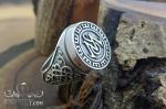 Массивная печатка из серебра 925 пробы с выразительной монограммой в центральной части. Круглая лицевая площадка подчеркнута контрастным чернением, которое усиливает глубину рельефа и делает символ более выразительным. По периметру размещён декоративный орнамент, создающий эффект классической печати и придающий украшению статусный характер.